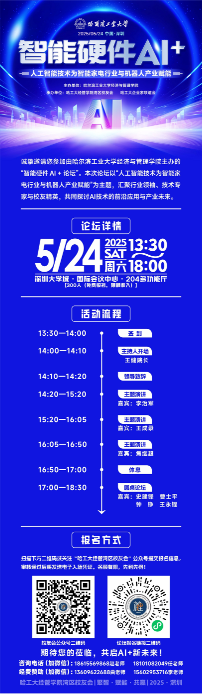 A century-old institution of learning passes on its legacy through generations; At the dawn of a new century, it embarks on a journey to write a new chapter. On the occasion of the 105th anniversary of Harbin Institute of Technology,The Alumni Association of the School of Management, Harbin Institute of Technology(HIT), jointly with the Entrepreneur Association of HIT and the Shenzhen Alumni Association of the School of Management, Harbin Institute of Technology together invite industry leaders, technical experts, and alumni elites, strive to create the "Smart Hardware AI+ Forum", jointly explore the commercial integration paths and global opportunities of AI technology in the smart home appliance and robotics industries, meanwhile, contribute insights to help the Guangdong-Hong Kong-Macao Greater Bay Area seize the strategic opportunities of the new round of scientific and technological revolution and industrial transformation.